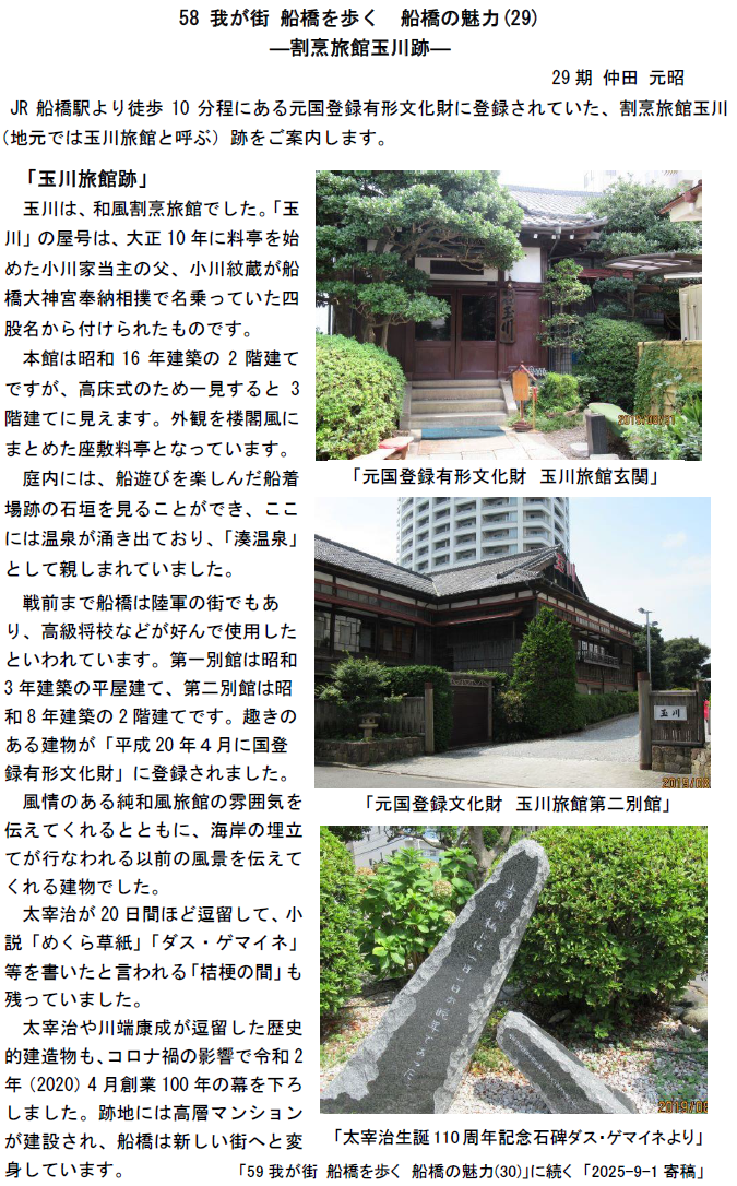 58 我が街 船橋を歩く 船橋の魅力(29)―割烹旅館玉川跡― 29期 仲田元昭 2025年9月投稿